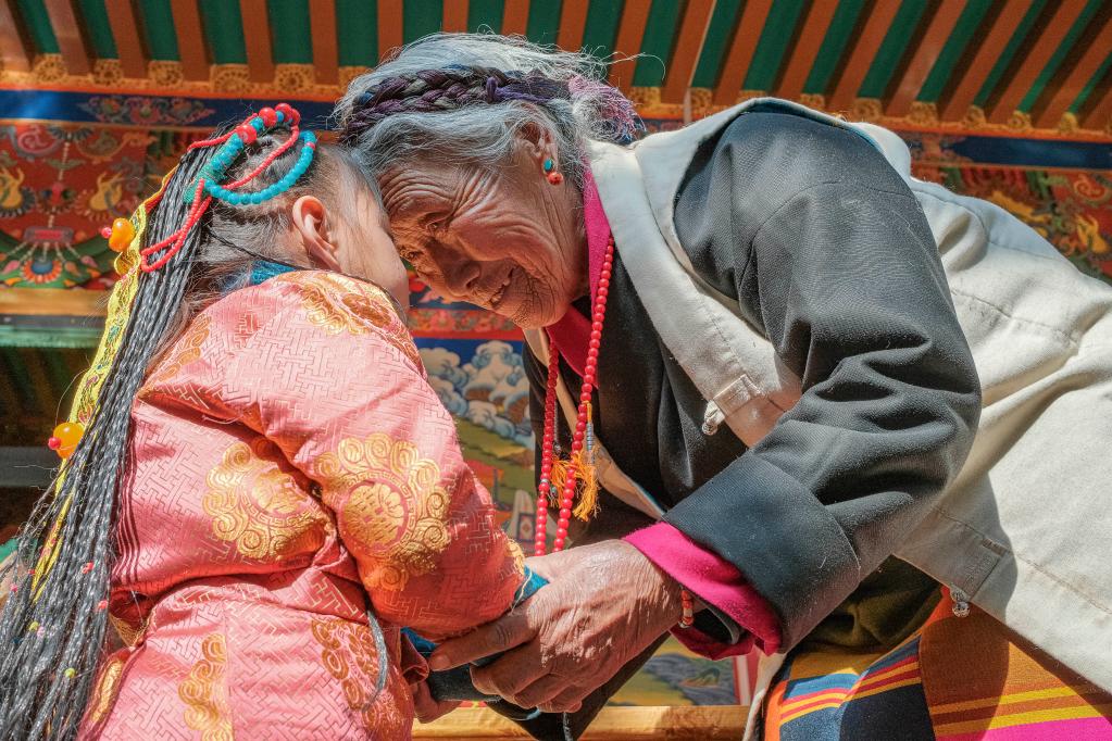 今年,西藏農家年和春節“巧遇”同一天,習俗雖不同,但年味皆濃。從縣城買來的年貨,一家人制作的切瑪和卡塞(油炸面食)等傳統供品和食品,紛紛擺上了桌。第四代的孩子們,也換上了嶄新的藏裝,頭戴綠松石點綴的頭飾,依偎在祖奶奶次旦的身旁。