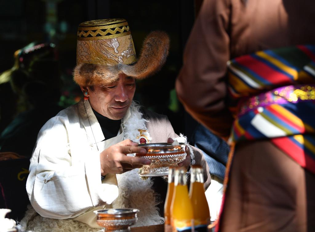 平拉在喝青稞酒。他胸前佩戴的全國勞模獎章是他最珍貴的寶貝(1月22日攝)。新華社記者 晉美多吉 攝
