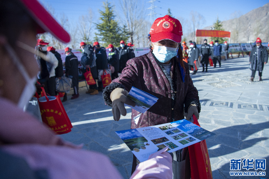 2月2日,拉薩市拉魯濕地國家級自然保護區管理局工作人員向群眾發放濕地保護宣傳單。新華網 旦增努布攝