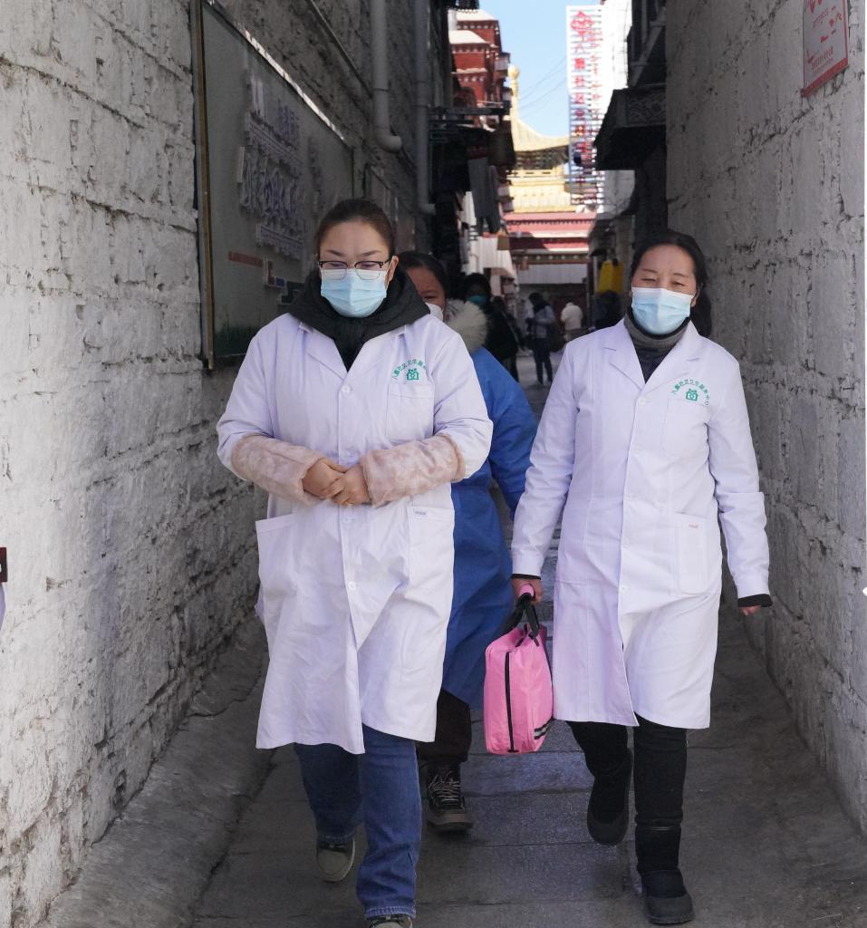 拉薩市八廓街道內,醫生拉吉(右一)和她的同事們在入戶隨訪途中。新華社記者黃耀漫 攝
