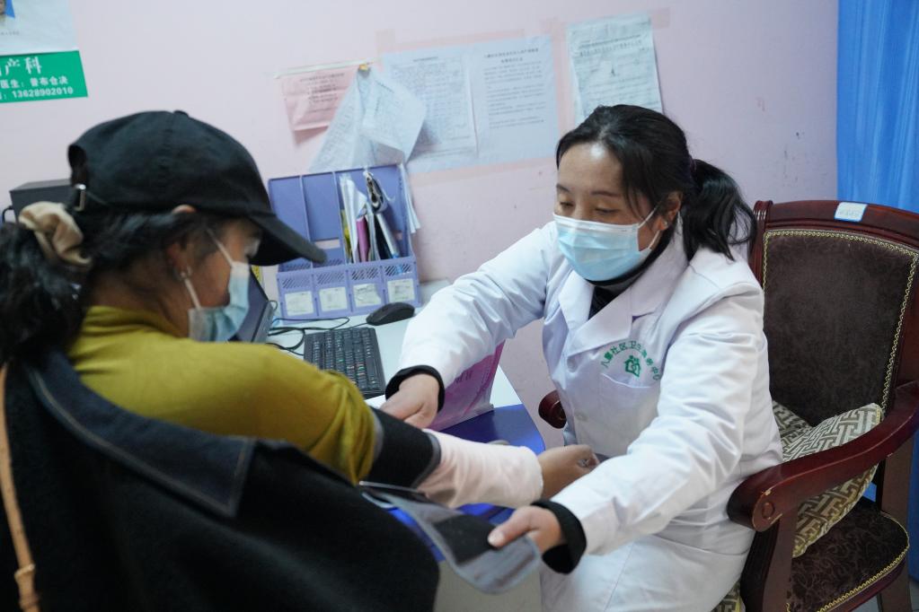 拉薩市八廓街道社區衛生服務中心的醫生(右)在為群眾做檢查。新華社記者黃耀漫 攝