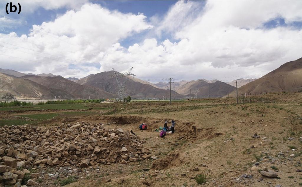 圖(b)為科考隊員發(fā)現(xiàn)共塘遺址后隨即進行地層剖面清理和樣品采集。(資料圖片由第二次青藏科考隊“人類活動歷史及其影響”分隊提供)