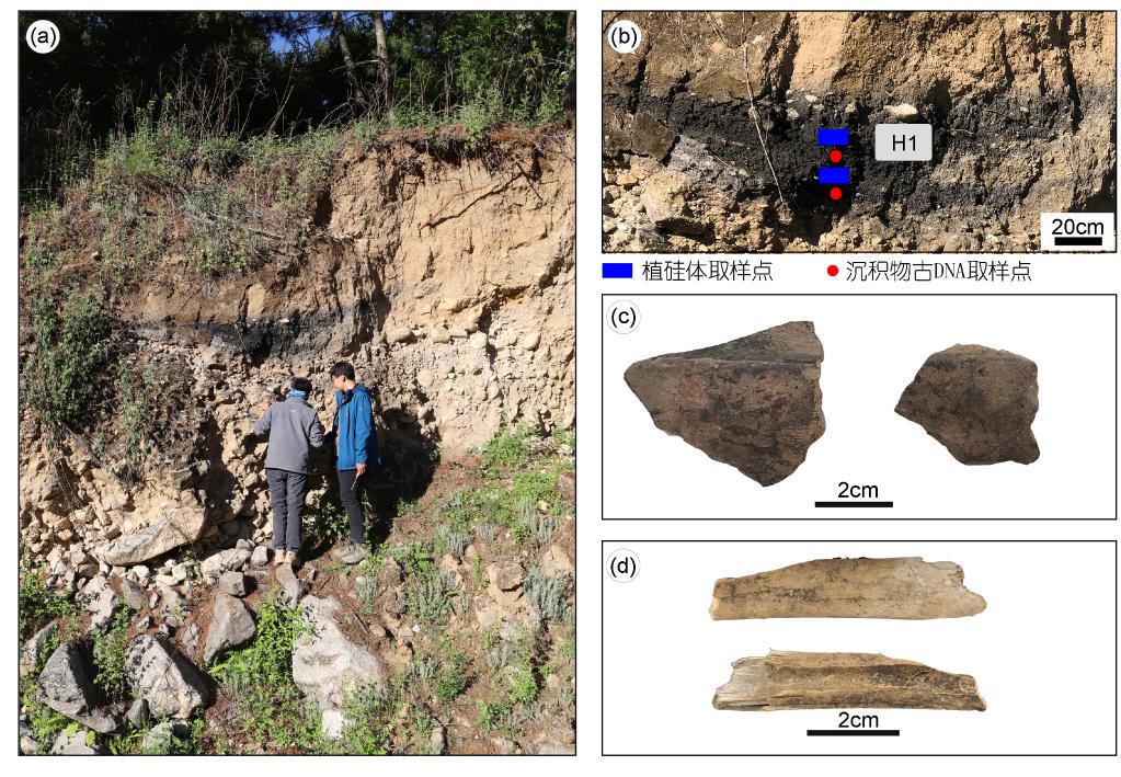 圖(a)孔桑橋遺址調查剖面圖;圖(b)采樣位置;圖(c)調查剖面出土陶片;圖(d)調查剖面出土動物骨骼。(資料圖片由聯合科考隊提供)