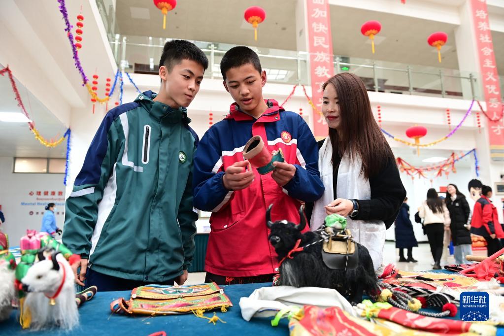 2月21日,學生在西安市浐灞第一中學舉行的藏歷新年團拜活動上展示象征五谷豐登的切瑪盒。新華社記者 李一博 攝