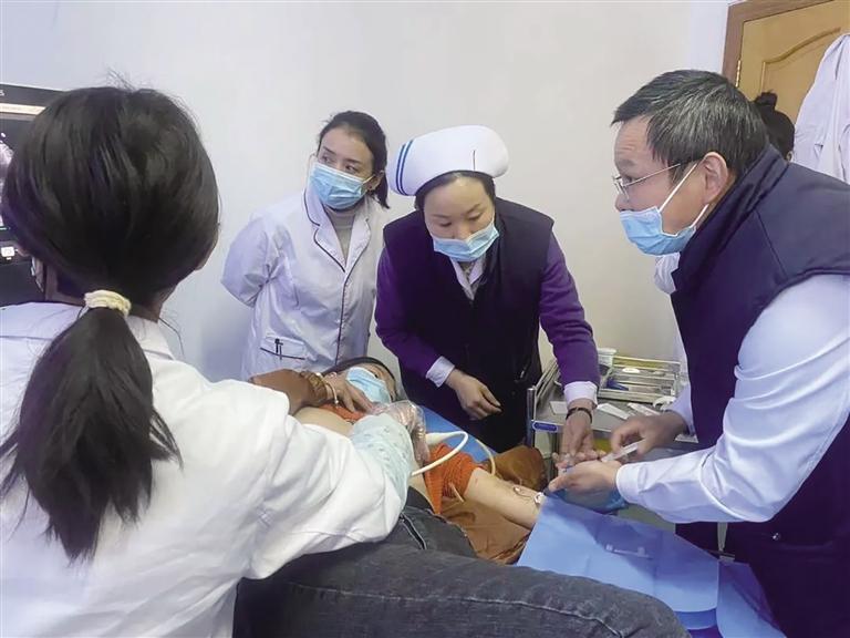 西藏自治區人民醫院超聲醫學科主任尼瑪玉珍操作超聲探頭(右二)。圖由西藏自治區人民醫院提供