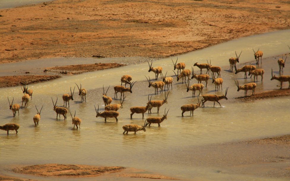 部分雄性藏羚在羌塘國家公園候選區江俄藏布泡澡 (羌塘國家級自然保護區管理局供圖)