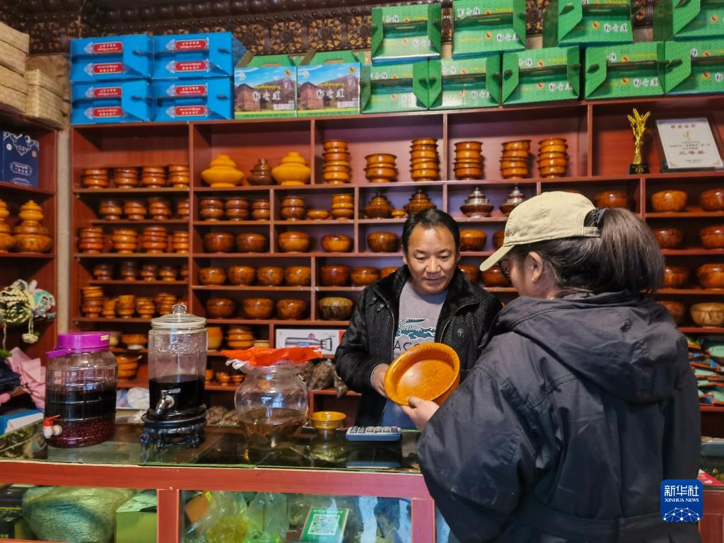 4月24日,游客在山南錯那市麻麻鄉次仁家的民宿中購買木碗。新華社記者 劉洪明 攝