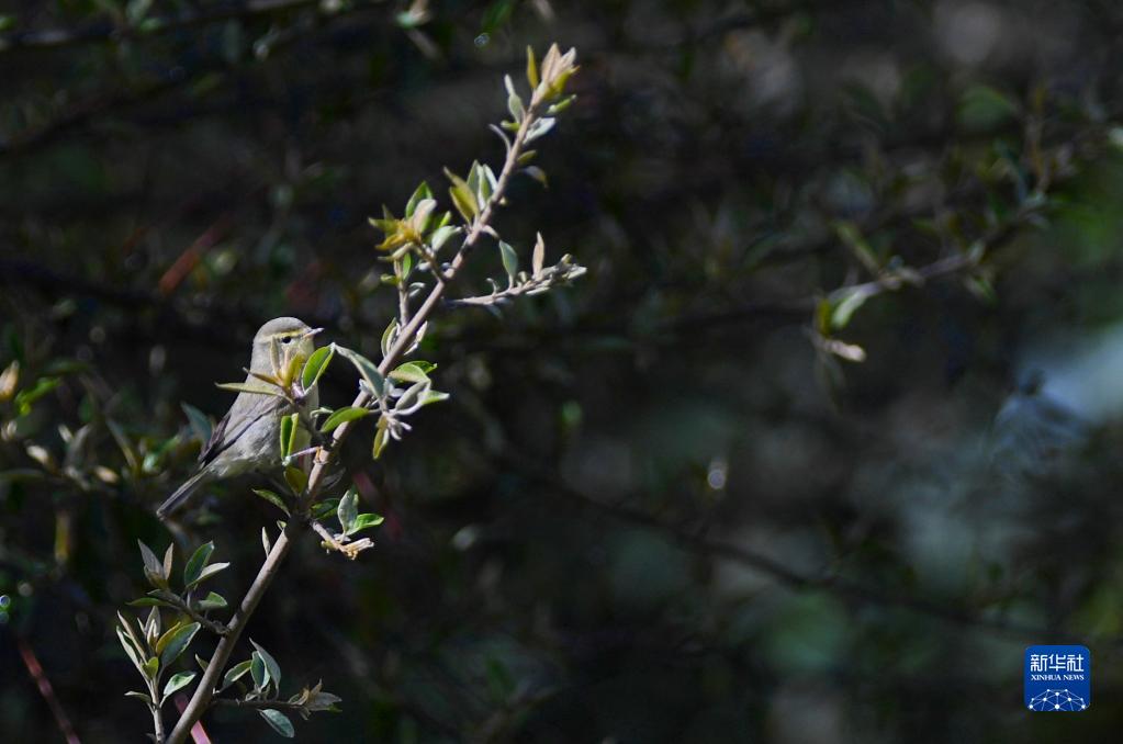 一只柳鶯在樹枝上起舞(4月25日攝)。新華社記者 張汝鋒 攝