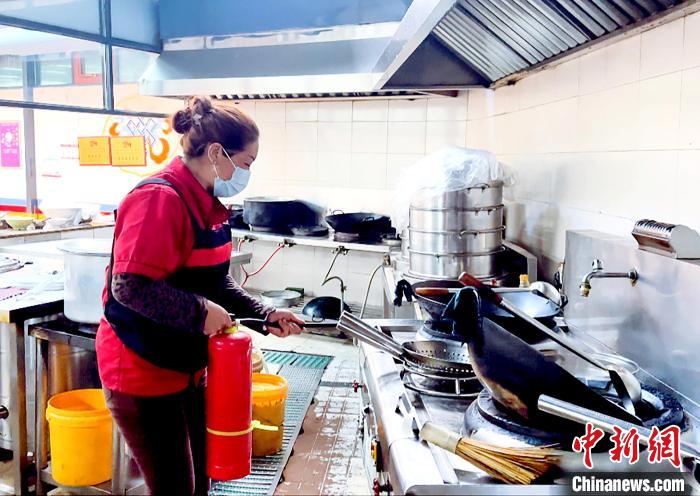 模擬廚房發生火災,員工發現火源后,立即關閉燃氣閥,拉閘斷電,第一時間利用周邊滅火器進行初期火災撲救。 劉瑜 攝