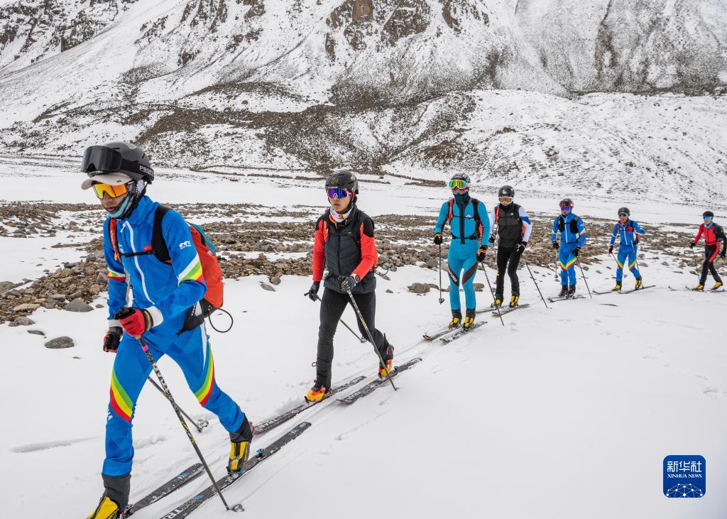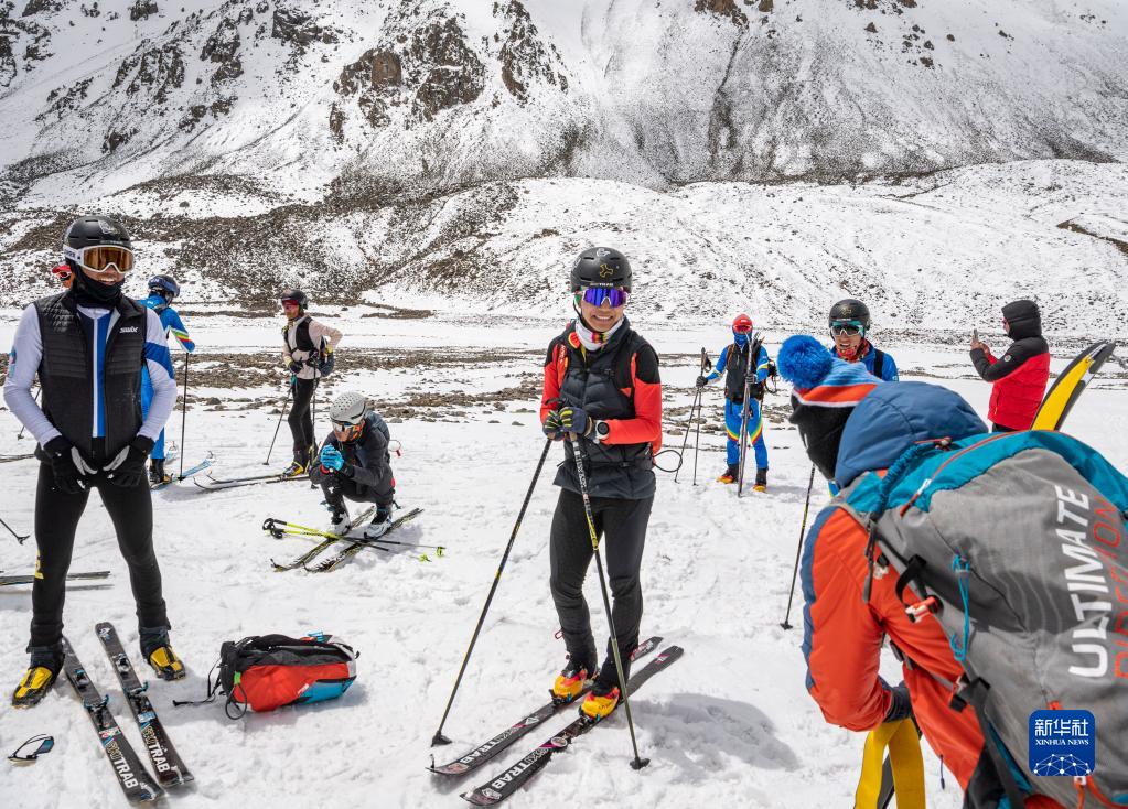 在西藏拉薩市當雄縣羊八井鎮,玉珍拉姆(左二)和隊友進行滑雪登山訓練(5月2日攝)。新華社記者 孫非 攝