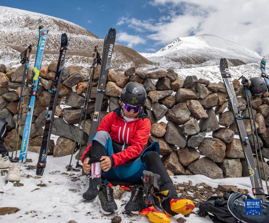 在西藏拉薩市當雄縣羊八井鎮,玉珍拉姆在訓練前為雪板粘貼止滑帶(5月2日攝)。新華社記者 孫非 攝