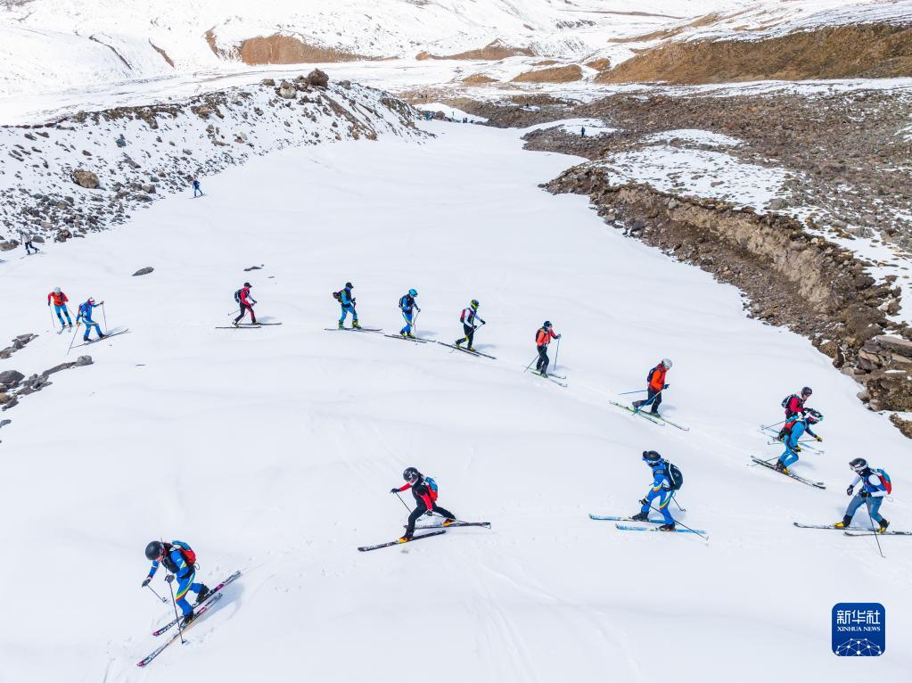 在新疆富蘊縣可可托海國際滑雪度假區,玉珍拉姆(前)參加全國首屆滑雪登山冠軍賽短距離(女子組)比賽(4月8日攝)。新華社記者 胡虎虎 攝