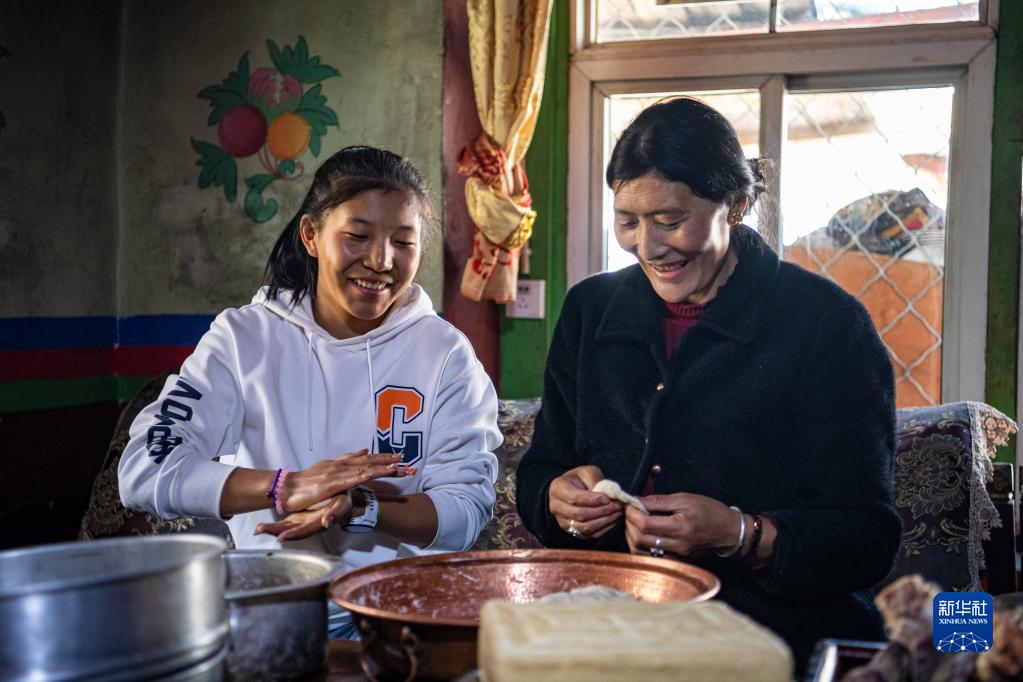 在位于西藏林芝市工布江達縣仲莎鄉的家中,玉珍拉姆(左)和媽媽一起做土豆包子(4月24日攝)。新華社記者 孫非 攝