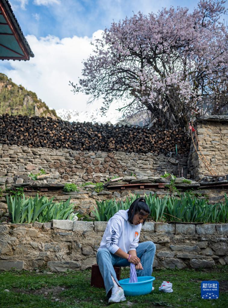 在位于西藏林芝市工布江達縣仲莎鄉的家中,玉珍拉姆在院子里洗衣服(4月24日攝)。新華社記者 孫非 攝