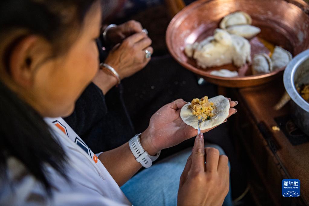 在位于西藏林芝市工布江達縣仲莎鄉的家中,玉珍拉姆在做土豆包子(4月24日攝)。新華社記者 孫非 攝