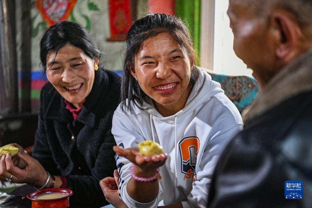在位于西藏林芝市工布江達縣仲莎鄉的家中,玉珍拉姆(中)向爸爸展示自己做的土豆包子(4月24日攝)。新華社記者 孫非 攝