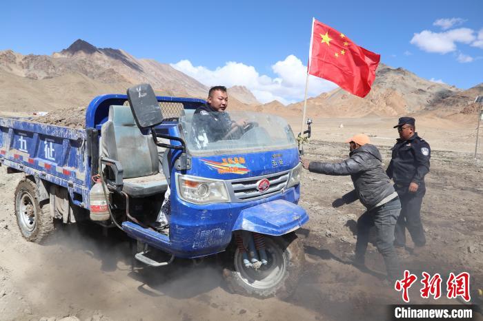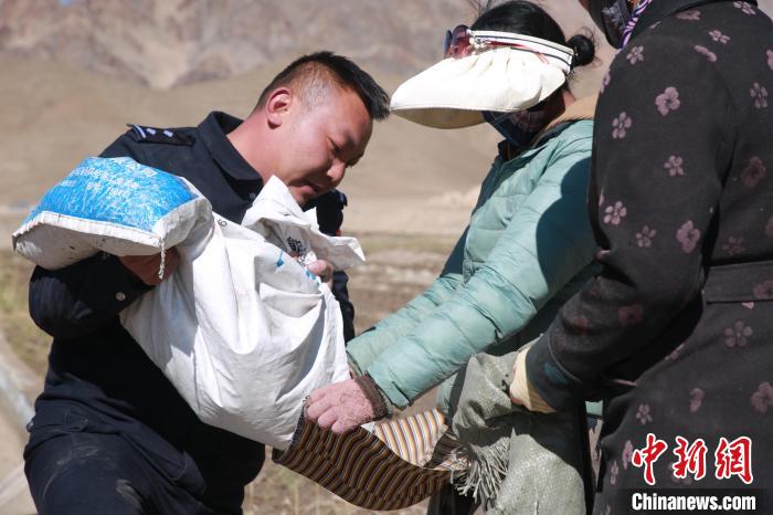 圖為民警任博與民眾分青稞。 湯子龍 攝