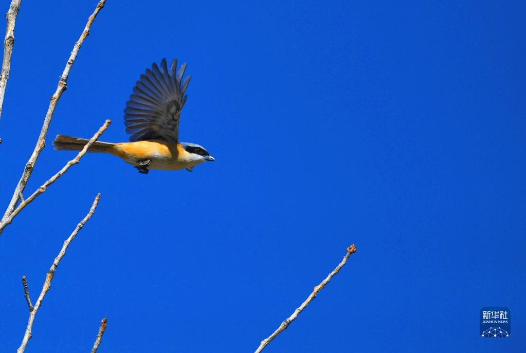 灰背伯勞在拉薩市城關區蔡公堂街道次角林村上空飛過(5月14日攝)。新華社記者 張汝鋒 攝