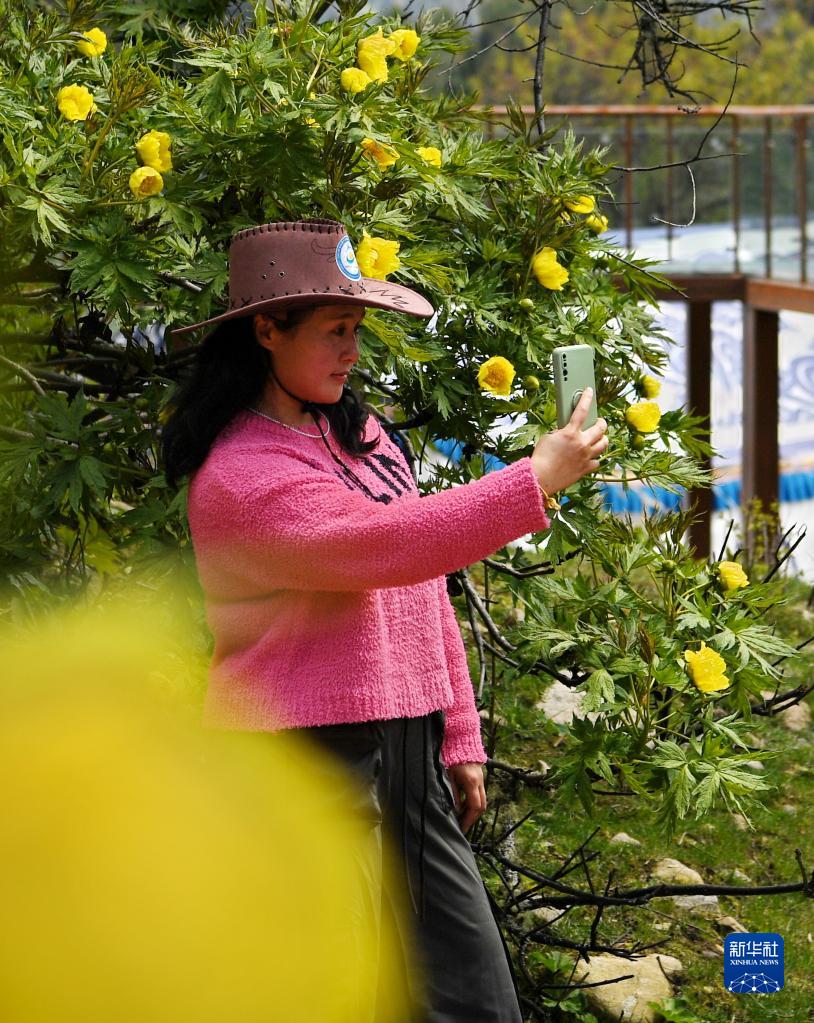 5月28日,一名游客在米林市南伊珞巴民族鄉扎貢溝野生大花黃牡丹前自拍。新華社記者 張汝鋒 攝