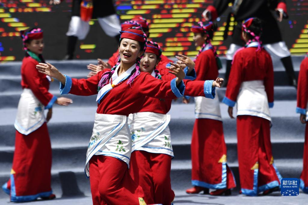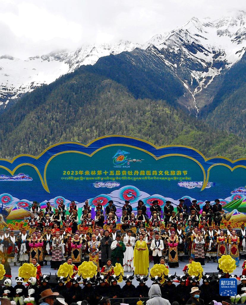 5月28日,演員在米林市第十五屆黃牡丹藏醫藥文化旅游節開幕式上表演節目。新華社記者 張汝鋒 攝