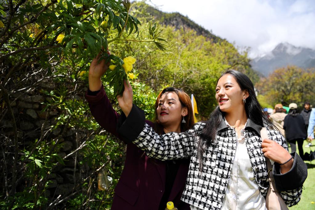 5月28日,兩名游客在米林市南伊珞巴民族鄉扎貢溝觀賞野生大花黃牡丹。新華社記者 張汝鋒 攝