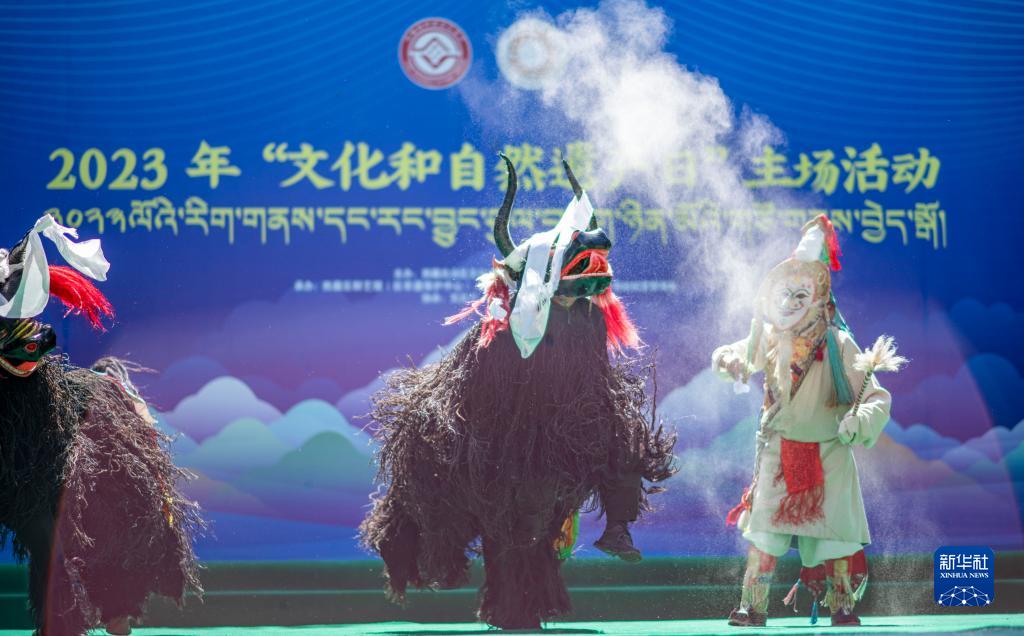6月10日,來自拉薩市曲水縣的國家級代表性傳承人桑珠(右)在開幕式上表演非遺節目協榮仲孜《野牦牛舞》。新華社記者 姜帆 攝