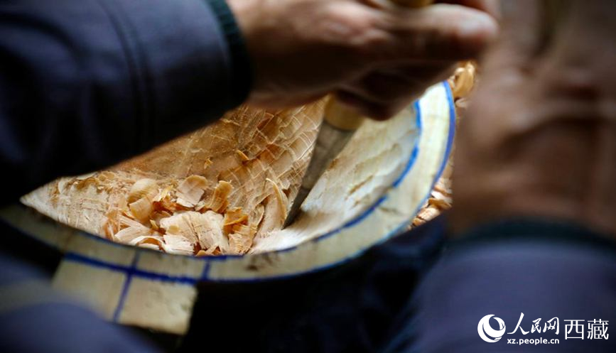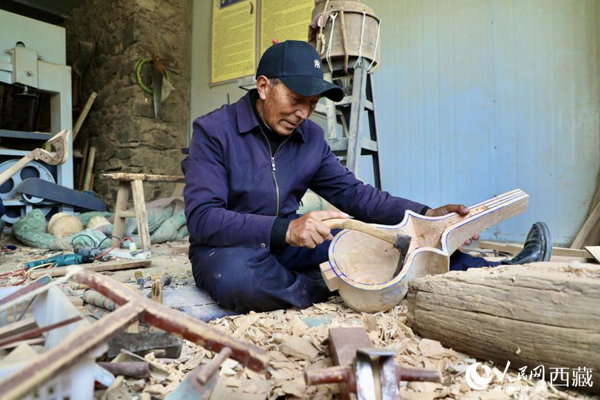 娘嘎扎念琴制作技藝傳承人羅布次旦在制作扎念琴。人民網記者 次仁羅布攝