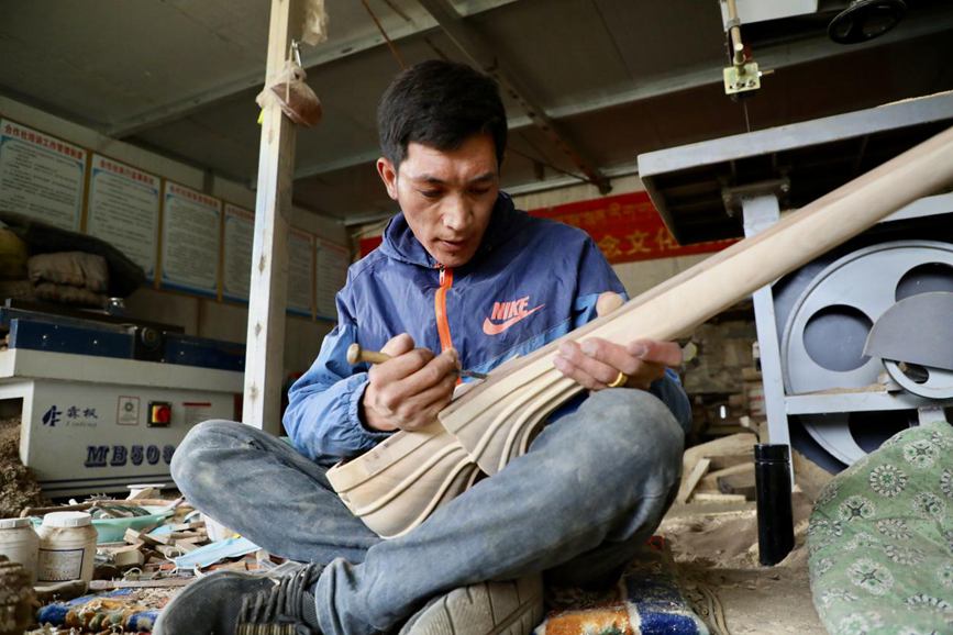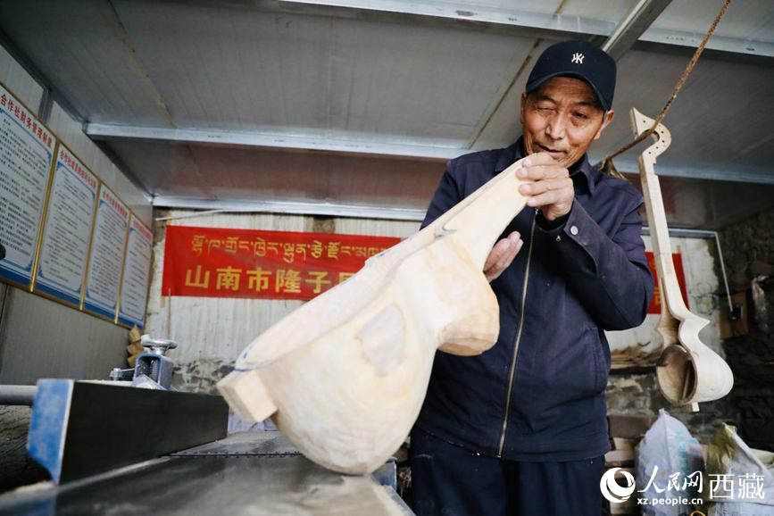 傳承人羅布次旦檢查琴體打磨后的樣板。人民網記者 次仁羅布攝