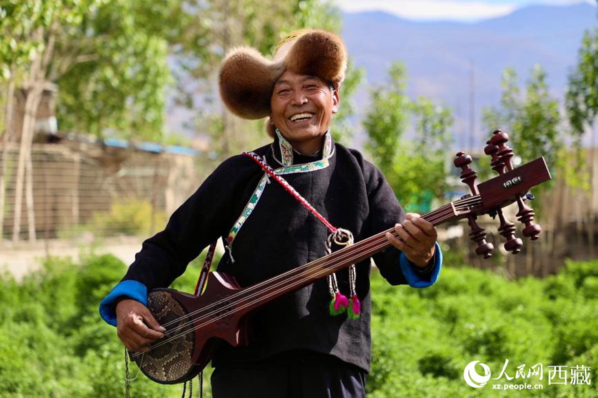 傳承人羅布次旦在彈奏扎念琴。人民網記者 次仁羅布攝