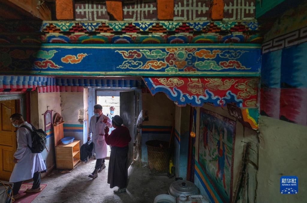6月12日,王振疆(左一)、王彤旭(左二)和陳冰(左三)走進64歲的次仁旺姆家中。她患有嚴重的類風濕性關節炎,關節變形,行動不便。新華社記者 費茂華 攝