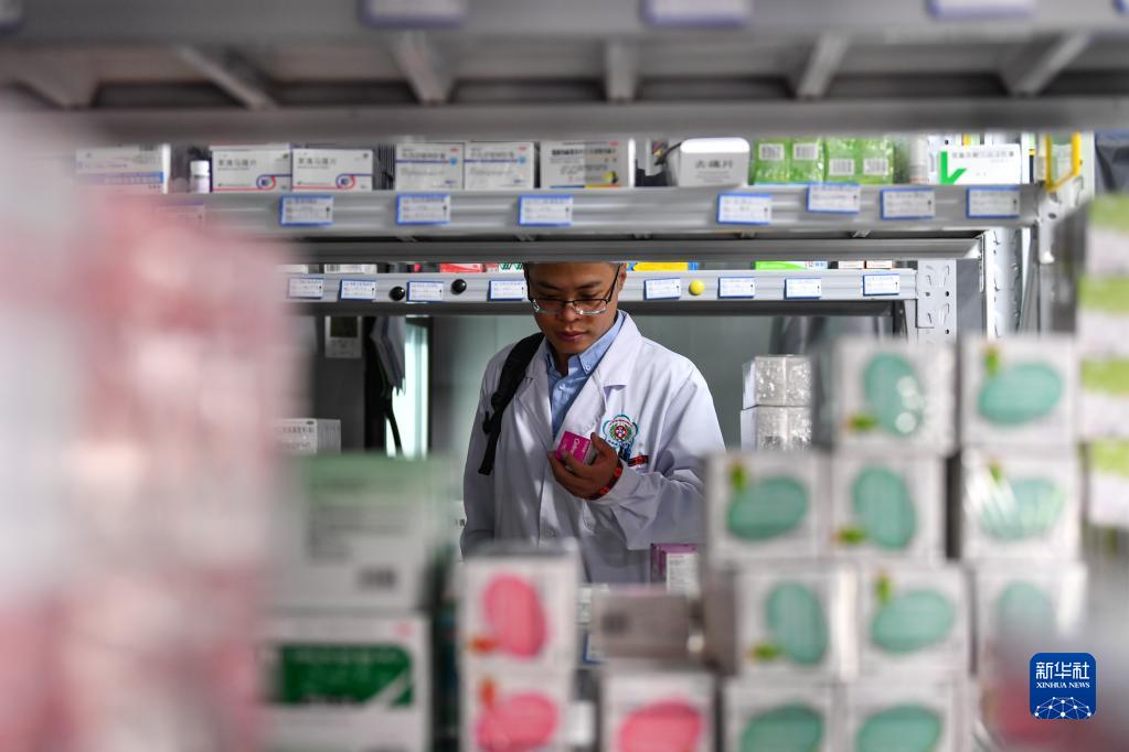 6月12日出發前,王振疆醫生在米林市人民醫院庫房領取藥品。新華社記者 晉美多吉 攝