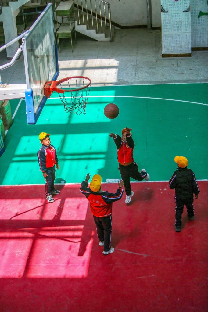 6月5日,扎西宗鄉完全小學學生在籃球課上投籃。