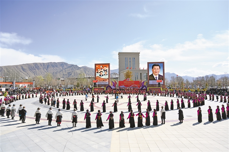 圖為日喀則市紀念西藏百萬農奴解放64周年群眾聯歡活動(3月28日攝)。 記者 扎西頓珠 攝