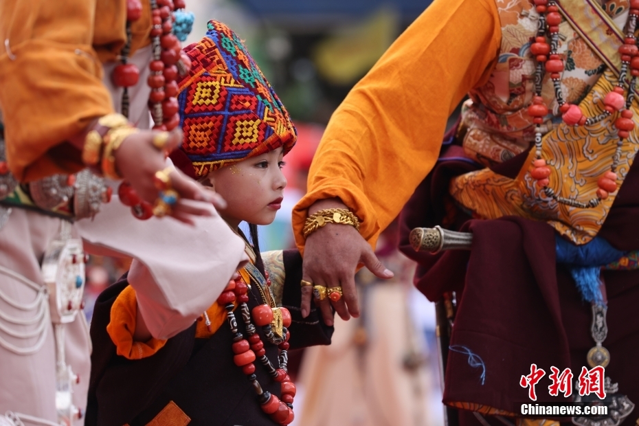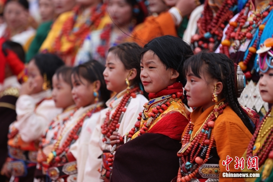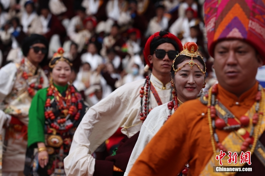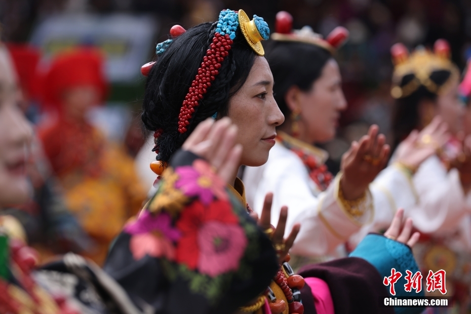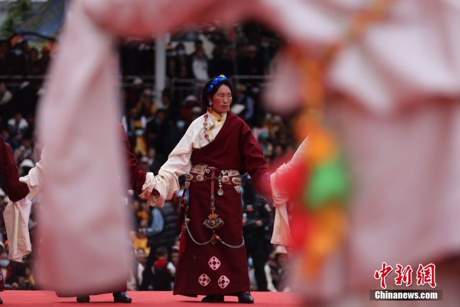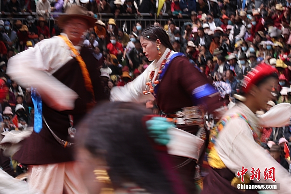 7月17日,西藏自治區昌都市貢覺縣,民眾身著極具特色的民族服裝服飾,載歌載舞出席當地的特色服飾展活動。
