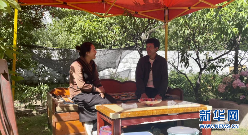 圖為嘎拉村村民達瓦參堅和妻子在自家的院子里聊天,身后是小菜園和不同的果樹。新華網 陳穎 攝