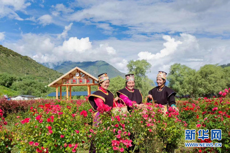 圖為當地村民在工布花谷玫瑰種植園內采摘玫瑰花朵。 (工布花谷 李磊 供圖)