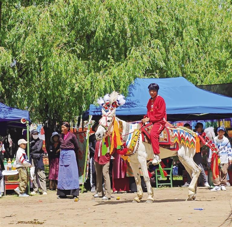另一旁,幾名游客正在跟精心打扮過的馬兒合影。馬主人耐心給游客們解釋,馬兒身上的數(shù)字是自家門牌號或組別。“我們是從湖南自駕游過來的,昨天經(jīng)過這兒聽說有望果節(jié),就留在這兒了,這里風(fēng)景美,村里人也都特別熱情。有位阿佳還給我們吃了自家煮的土豆和牛肉,真的太好吃了!”游客李高棟說。