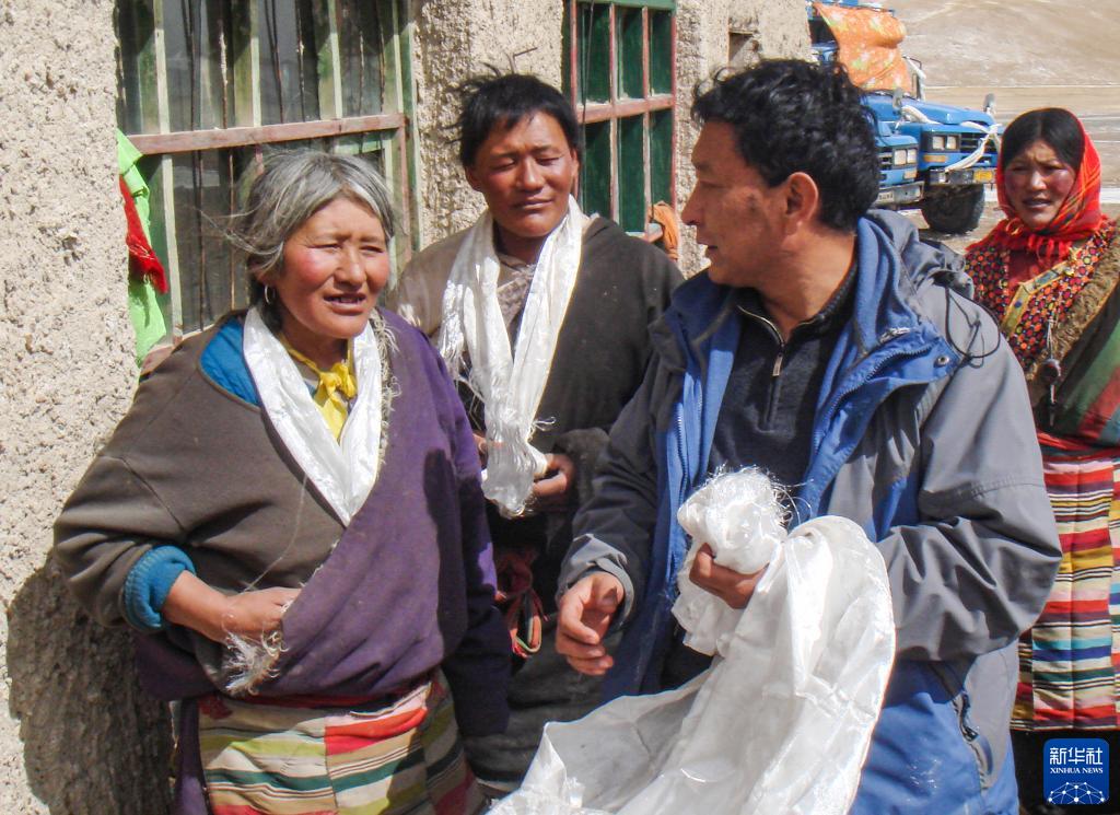 在西藏那曲市申扎縣曲松普村駐村期間,邊巴(前右)到群眾家中慰問(資料照片)。新華社發(受訪者供圖)