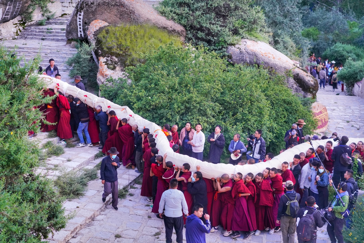 8月16日,西藏拉薩哲蚌寺,僧人將巨幅唐卡抬往展佛臺。西藏日報社 平措次仁 攝