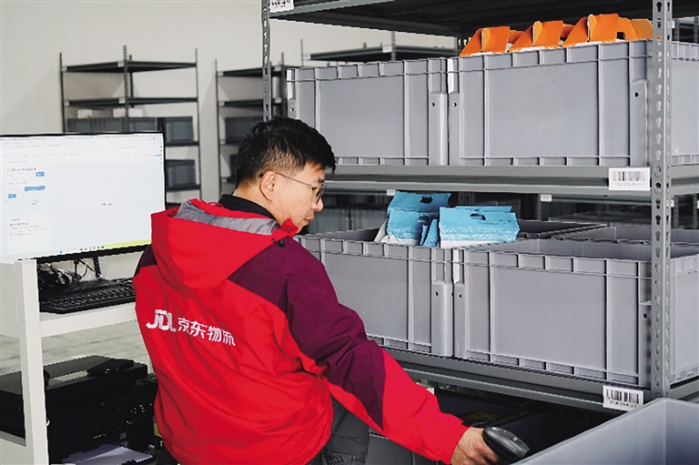 京東物流工作人員在林芝農產品前置智能倉內揀選貨物。