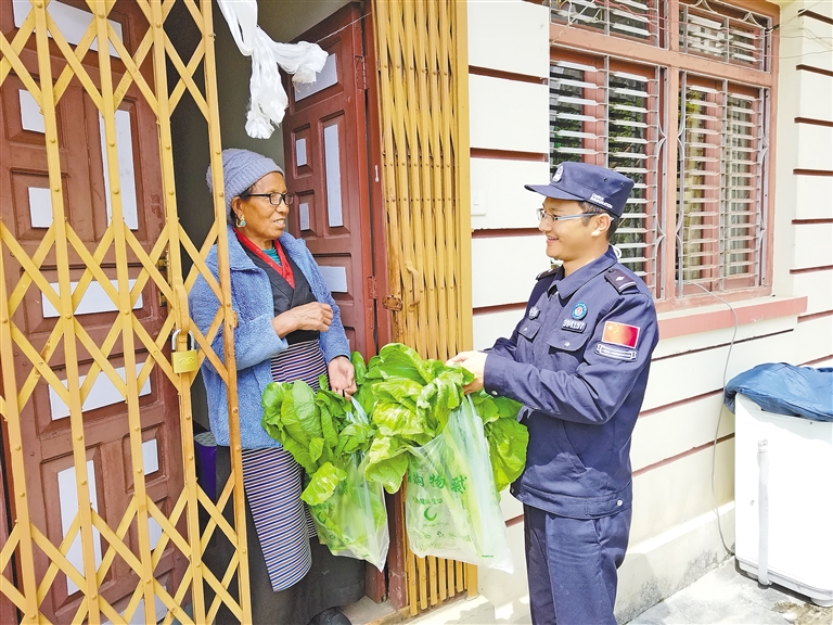 立新邊境派出所民警文昌太給轄區孤寡老人送去自己種的蔬菜。 圖片由日喀則邊境管理支隊提供