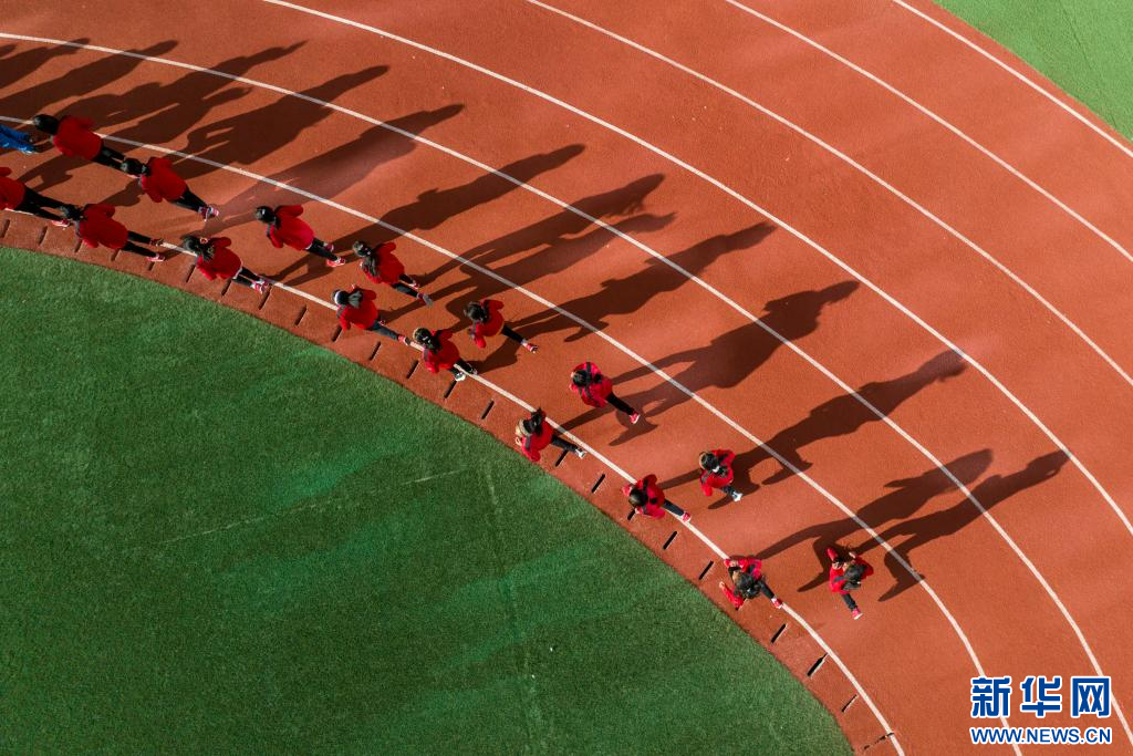 圖為那曲市第三小學學生在做體能訓練(9月5日攝,無人機照片)。新華網 旦增努布 攝