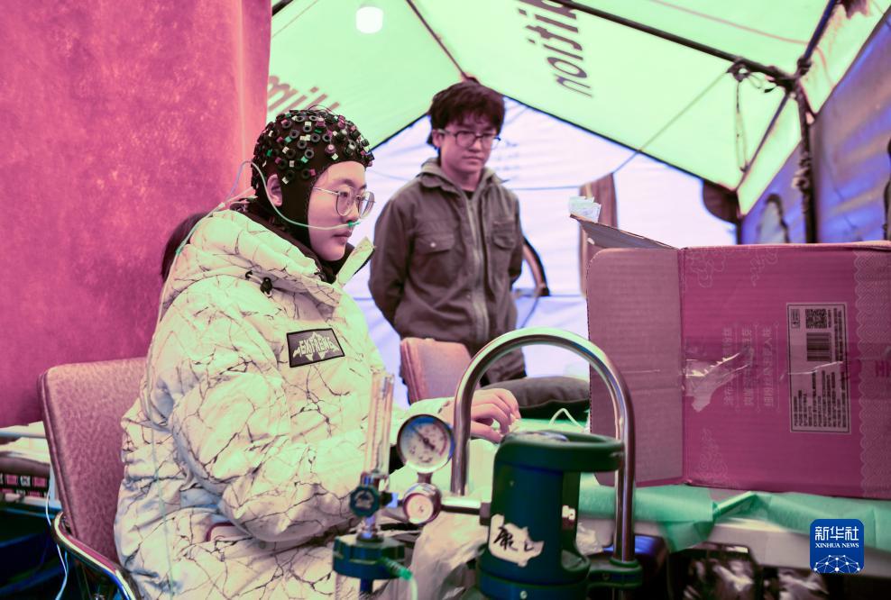 在卓奧友峰登山大本營,科考隊員(前)佩戴全腦彈性測試帽,測試有氧和無氧狀態下的人體認知能力(9月29日攝)。新華社記者 晉美多吉 攝