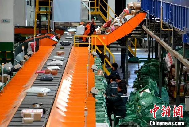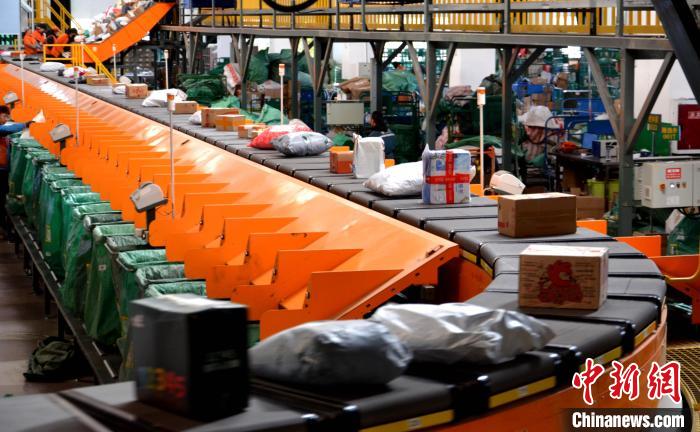 圖為自動化分揀設備正在分揀快遞包裹。西藏自治區郵政管理局供圖