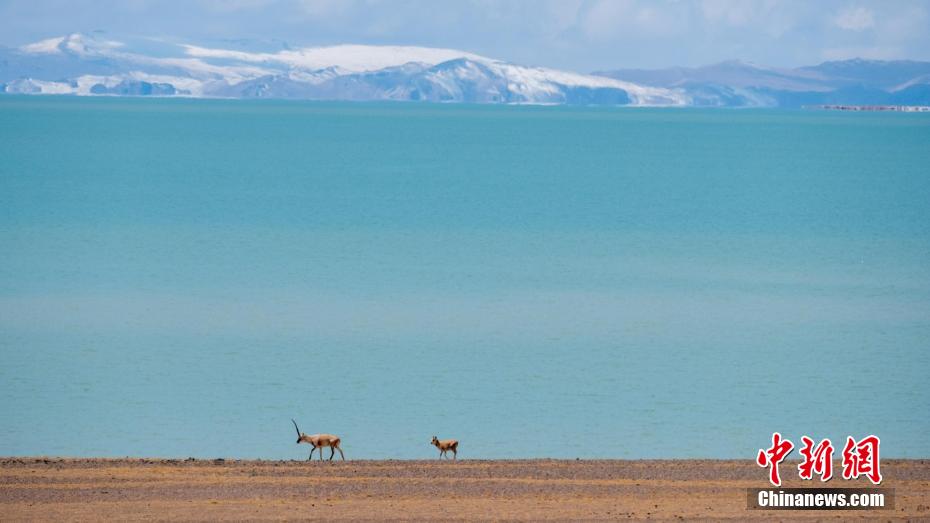資料圖為西藏色林錯湖畔的藏羚羊和遠處的雪山風光。江飛波 攝
