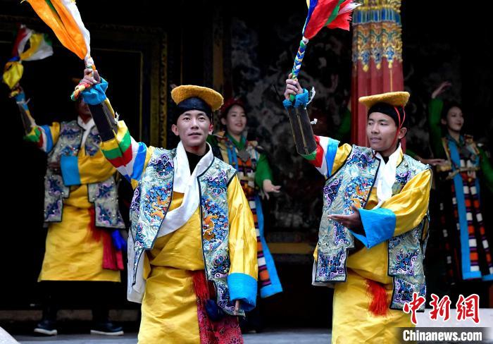 據(jù)悉,堆諧最早流傳于日喀則,是由扎念琴樂(lè)器伴奏的舞蹈。扎念琴是堆諧“邊彈、邊唱、邊舞”表演風(fēng)格形成的關(guān)鍵。作為日喀則市桑珠孜區(qū)的重要非遺項(xiàng)目之一,堆諧以其獨(dú)特的表演形式,受到了眾多觀眾的喜愛(ài)。日喀則市諧欽則起源于1883年,其韻調(diào)古樸,表現(xiàn)獨(dú)特,顯示出濃郁的西藏風(fēng)景和鮮明的地方特色。諧欽演員們精湛的表演技藝、華麗的戲服,將古老的西藏歌舞藝術(shù)完美呈現(xiàn)在這座古建筑前。