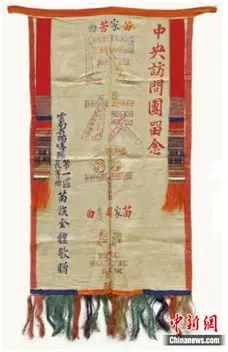 國家民委主辦的“鑄牢中華民族共同體意識文物古籍展”正在民族文化宮展出。圖為展覽中展出的新中國成立后云南省西疇縣第一區長箐鄉苗族全體敬獻中央訪問團的錦旗。民族文化宮供圖