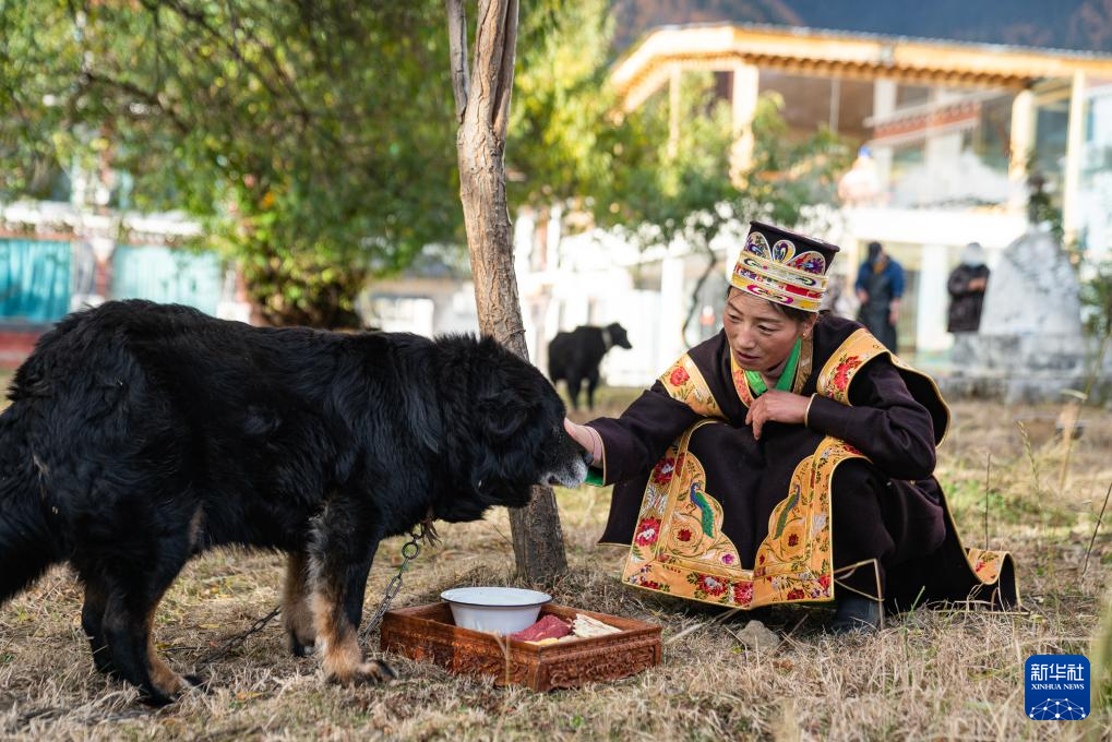 工布新年的大年初一,拉巴卓瑪按照習(xí)俗“請狗赴宴”,為家里的狗端來了新鮮牛肉、糌粑和牛奶(11月14日攝)。新華社記者 丁增尼達(dá) 攝