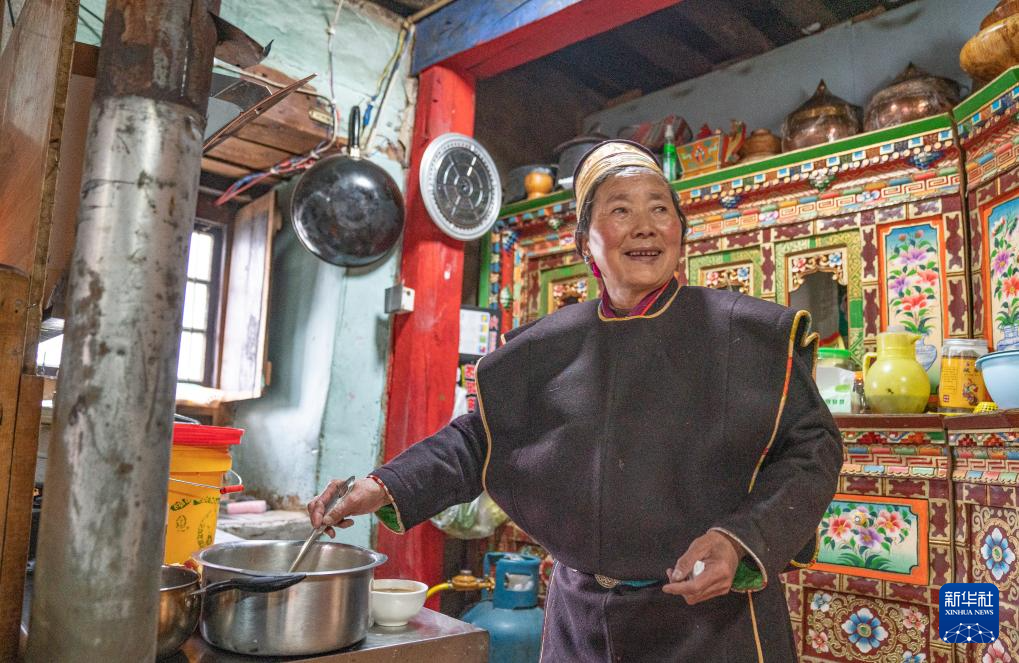 工布新年的大年初一,拉巴卓瑪一早就穿著傳統(tǒng)工布藏裝開始忙碌(11月14日攝)。新華社記者 黃耀漫 攝