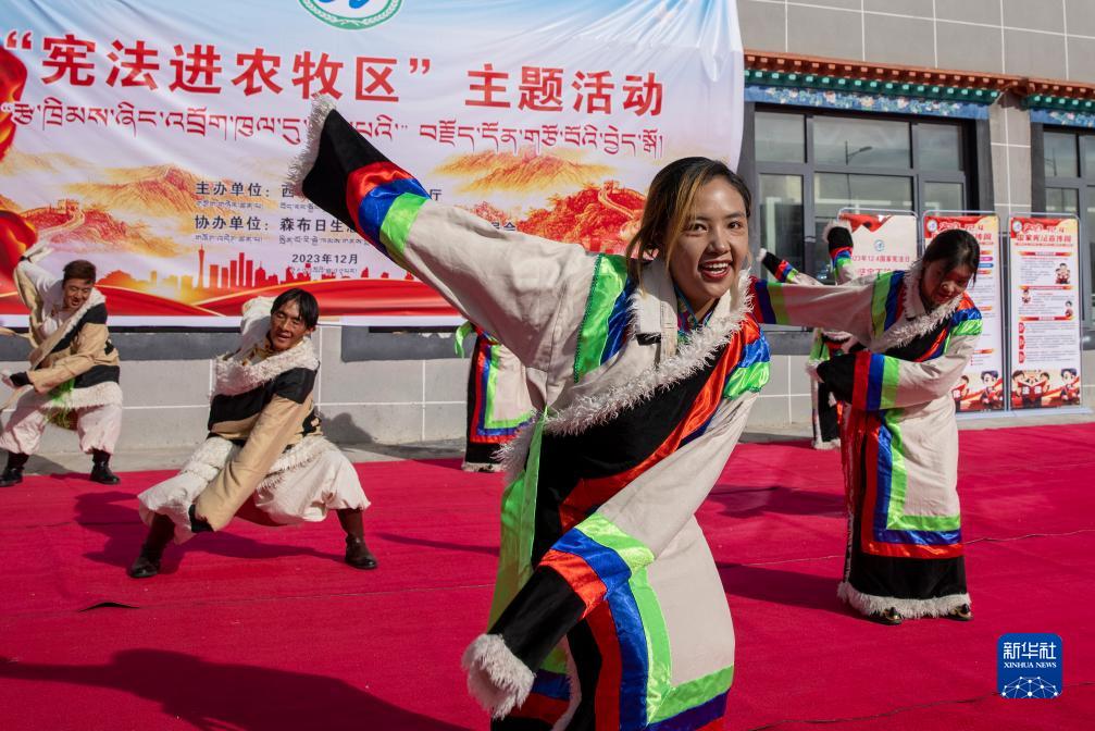 12月6日,森布日生態搬遷安置點的群眾在“憲法進農牧區”主題活動上表演歌舞。新華社記者 姜帆 攝